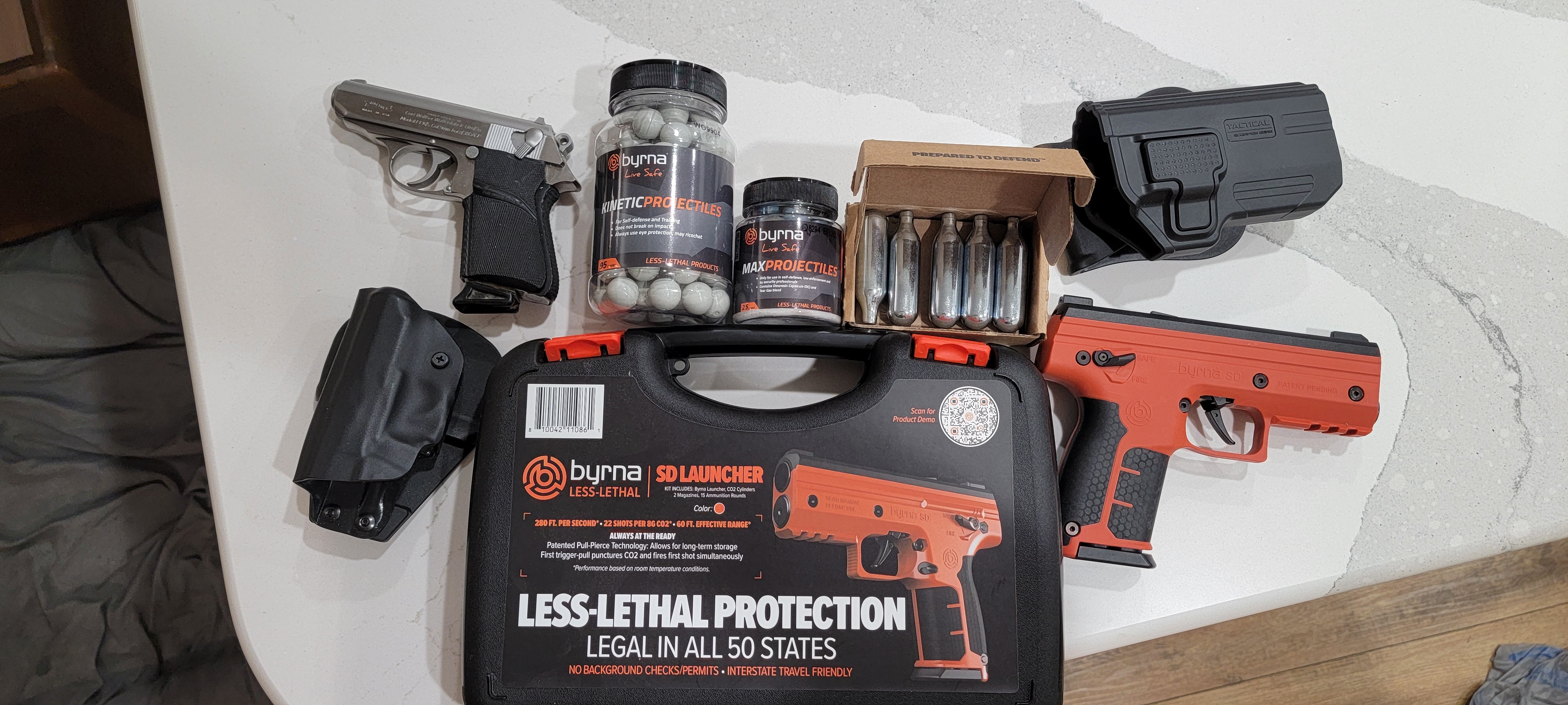 I am from Florida and I carry both of my 2 guns pictured in this post while I am in Illinois. (The one in orange is not a firearm but is a self-defense instrument that is legal in all 50 states (from Byrna.com). Click thumbnail for larger image....